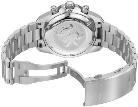Этот спортивный хронограф, оснащенный однонаправленно вращающимся алюминиевым безелем, с легкостью преодолевает любые испытания. Неудивительно, ведь владельцы этого кварцевого хронометра с сертификатом COSC всегда уверены в точности его показаний. Помимо выдающейся точности хода, он обладает водонепроницаемостью до 30 бар и прочной конструкцией, что делает его идеальным компаньоном в любых обстоятельствах. Вес 180 гр. Для корпуса, браслетов и застежек своих часов марка Certina использует нержавеющую сталь 316L, отличающуюся повышенной износостойкостью, устойчивостью к коррозии и гигиеничностью. В стали содержится совсем небольшое количество никеля, поэтому этот материал не вызывает аллергии при носке. Алюминий отличается высокой прочностью, гипоаллергенностью и устойчивостью к коррозии и перепадам температур. Кроме того, это чрезвычайно легкий металл: он в три раза легче стали и почти в полтора раза легче титана. Благодаря этим качествам марка Certina выбрала алюминий для производства ультралегких корпусов и застежек. Мануфактура использует только анодированный алюминий. Этот особо прочный защитный слой не только делает материал надежнее, но и позволяет окрашивать изделие в разные цвета. Super-LumiNova (SLN) представляет собой cветящийся материал с фосфоресцирующими свойствами. В темноте SLN типа BG W9, который использует Certina, испускает свет в виде голубого мерцания. SLN не вредит здоровью и используется для нанесения на стрелки, индексы и безели. В темноте он через некоторое время теряет свои фосфоресцирующие свойства, но они автоматически восстанавливаются на свету. Сапфировое стекло состоит из порошка оксида алюминия (Al2O3), раскаленного до 2.000 °C. Получаемые в результате сапфировые пласты нарезаются на тонкие пластины, им придают требуемую форму и полируют. Сапфир абсолютно прозрачен, обладает высокой устойчивостью к царапинам и механическим повреждениям. По этим причинам сапфировое стекло стало неотъемлемой деталью концепции DS и используется во всех моделях Certina для защиты циферблата. Хронометр ETA G10.212 с хронографом на 30 минут, индикатором окончания срока службы элемента питания и 1/10 секунды (в режиме реального времени). Счетчик десятых долей секунды повышает престижность любого хронографа: Некоторые модели Certina имеют этот счетчик на дополнительном циферблате у отметки «2 часа». Счетчик активируется нажатием кнопки и автоматически останавливается по истечении минуты, хронограф же продолжает отсчитывать время с точностью до десятой доли секунды. PrecidriveTM - Название инновационной технологии, обеспечивающей исключительную точность хода изделий Certina: Точность часов с кварцевым калибром Precidrive может сравниться с хронометрами. Часы Precidrive с погрешностью до +/-10 секунд в год в 8–10 раз точнее обычных кварцевых часов. Некоторые кварцевые часы Certina – как, например, все модели Precidrive, будь то вариант с тремя стрелками или хронограф – имеют указатель окончания срока службы элемента питания (EOL). Эта функция позволяет узнать, когда завершится срок службы элемента питания: В этом случае секундная стрелка движется с интервалами в 4 секунды, и элемент питания необходимо заменить в течение двух недель. Хронометрами имеют право называться только те часы, которые прошли сложные проверки независимой комиссии и получили сертификат точности. Организа