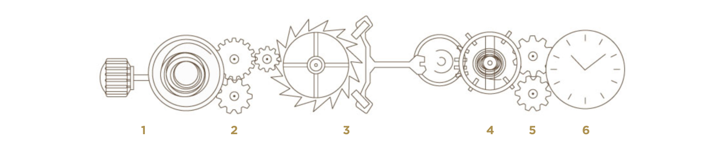Еще одна серия шестерен, которые передают регулируемую, одинаково дозированную энергию от балансира к стрелкам часов, заставляя их двигаться.