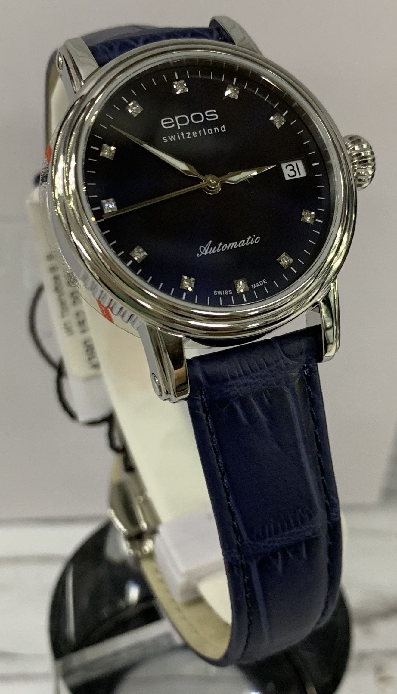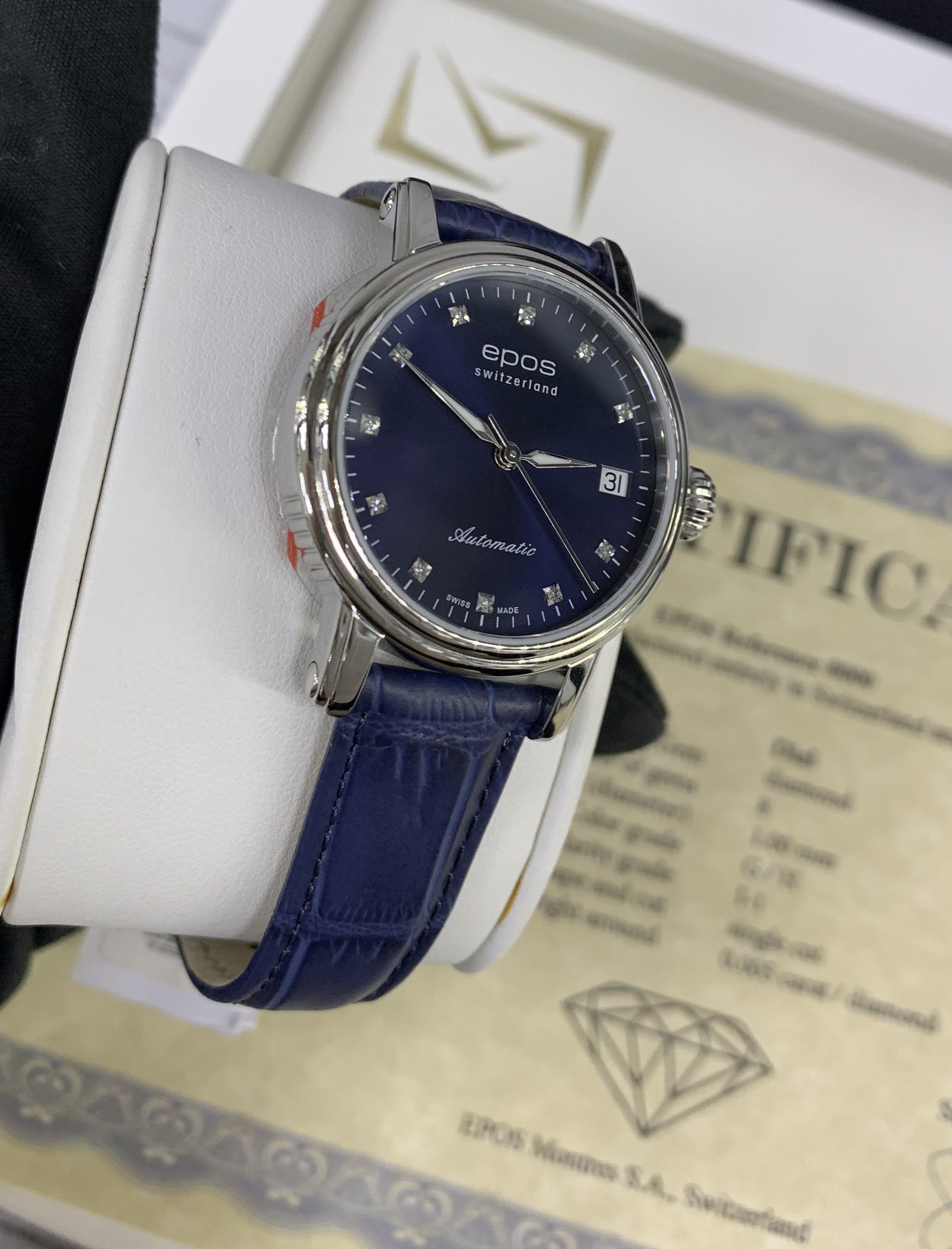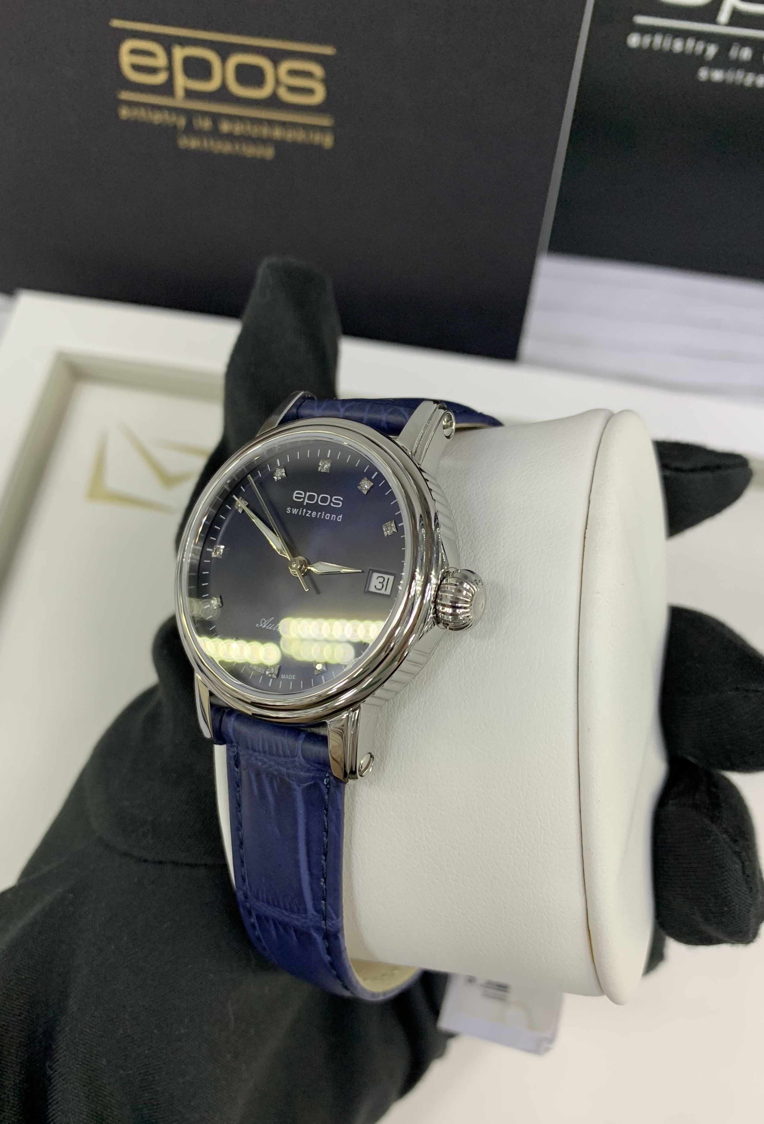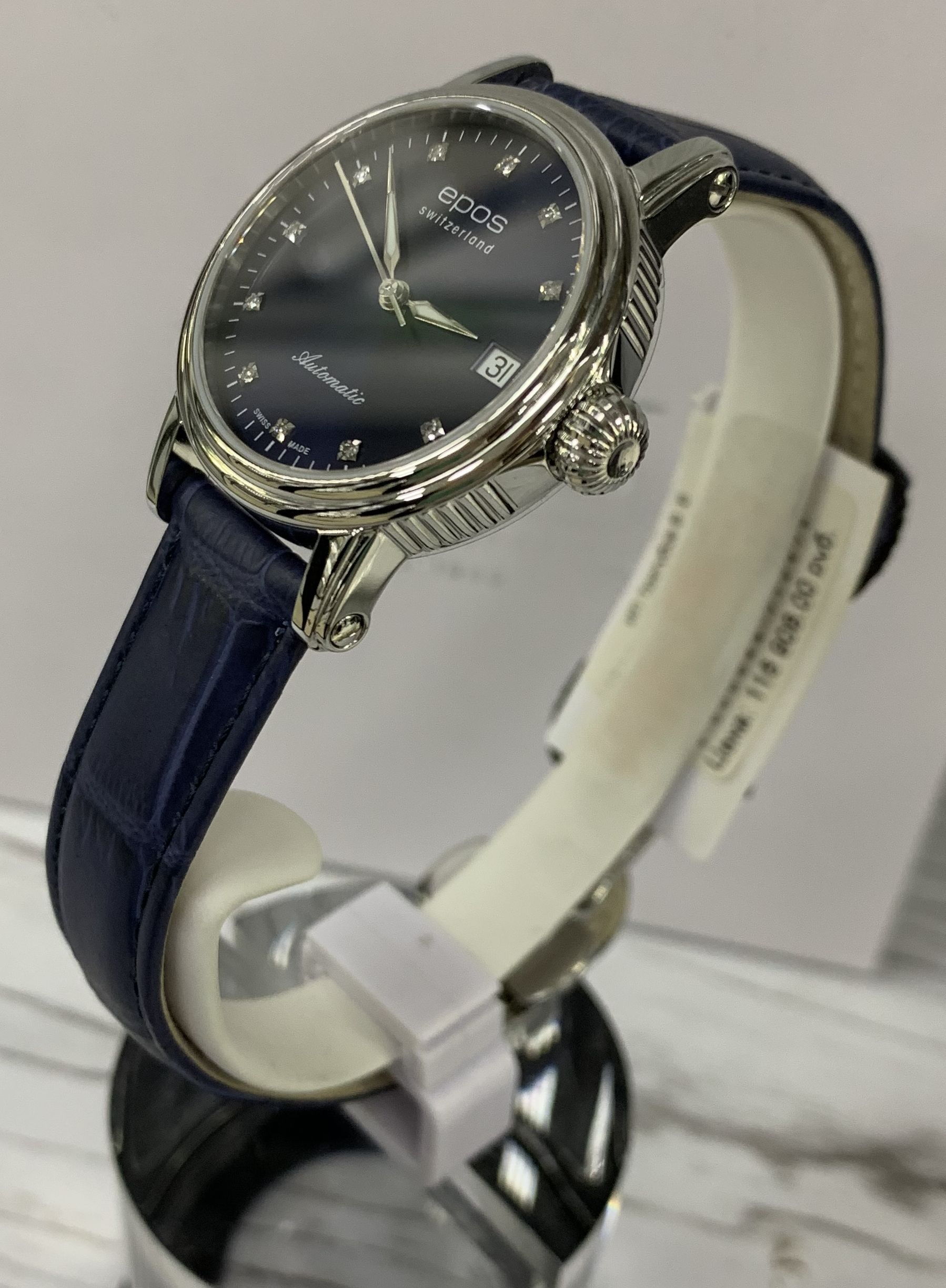 Швейцарские механические женские наручные часы с ручным и автоподзаводом Epos 4390.152.20.86.16 на кожаном ремне из натуральной кожи теленка. Корпус часов из нержавеющей стали. Циферблат круглой формы. Сапфировое стекло по прочности, уступающее только алмазу. Водозащита часов 50 метров. Окно даты. Диаметр корпуса: 34 мм. Толщина корпуса: 8 мм. Калибр механизма: ETA 2892. Размер браслета: 16-14 мм. Вставка (количество): 11 Бриллиантов. Кр.17 -0,051 ct -2/3. Вставка (производитель): EPOS Uhren AG, Solothurnstrasse 44, / CH-2543 Lengnau, Switzerland.