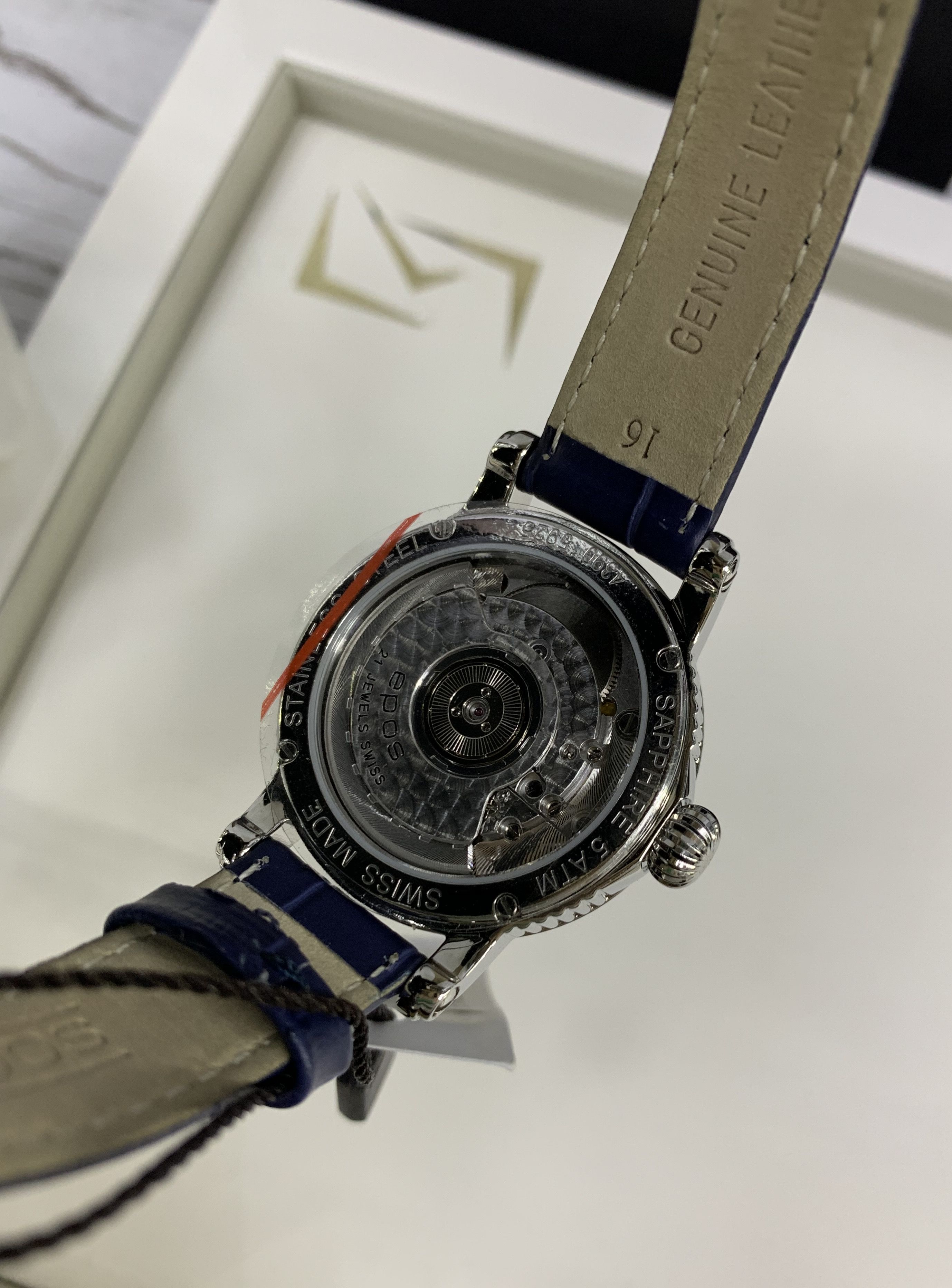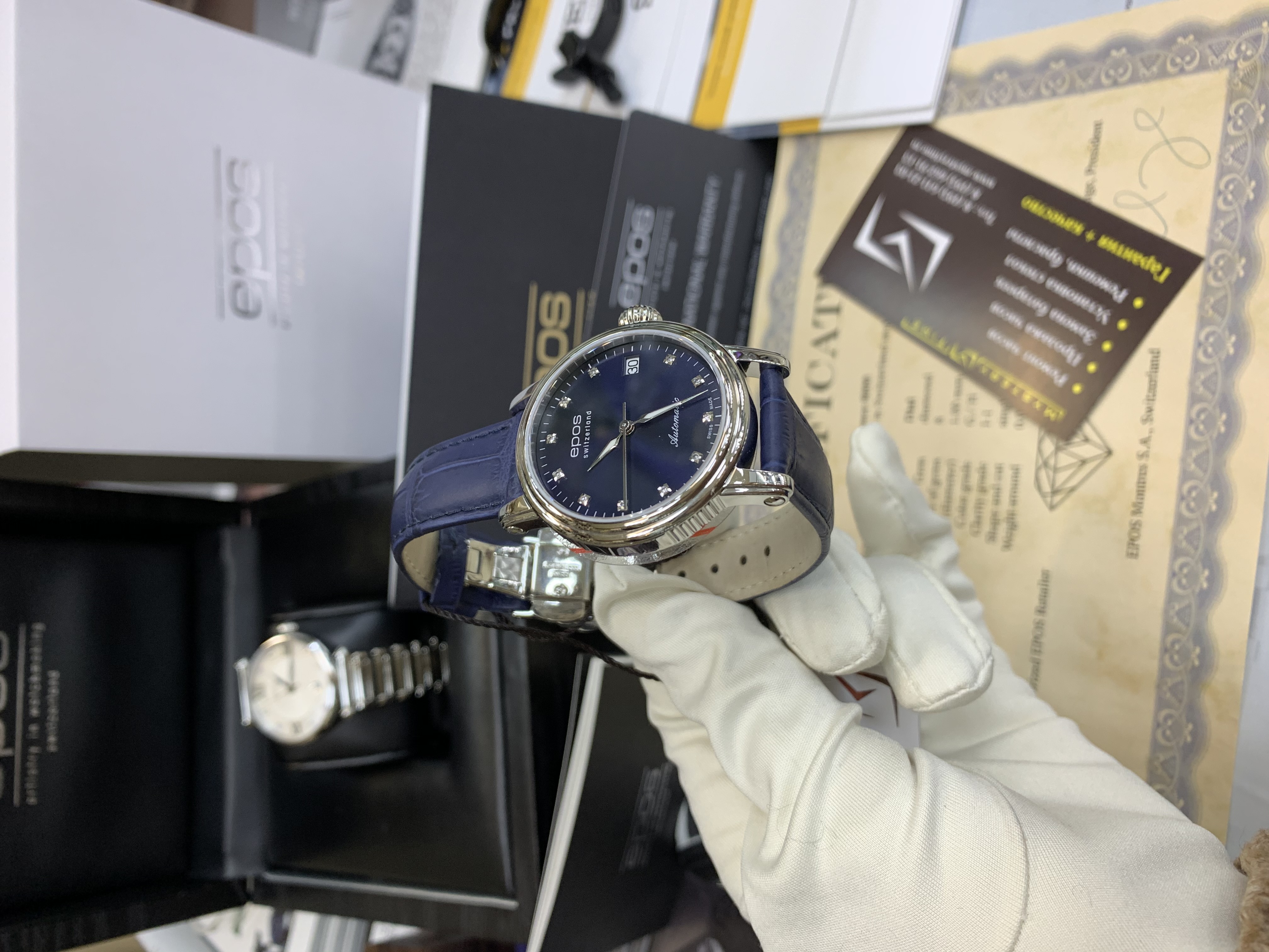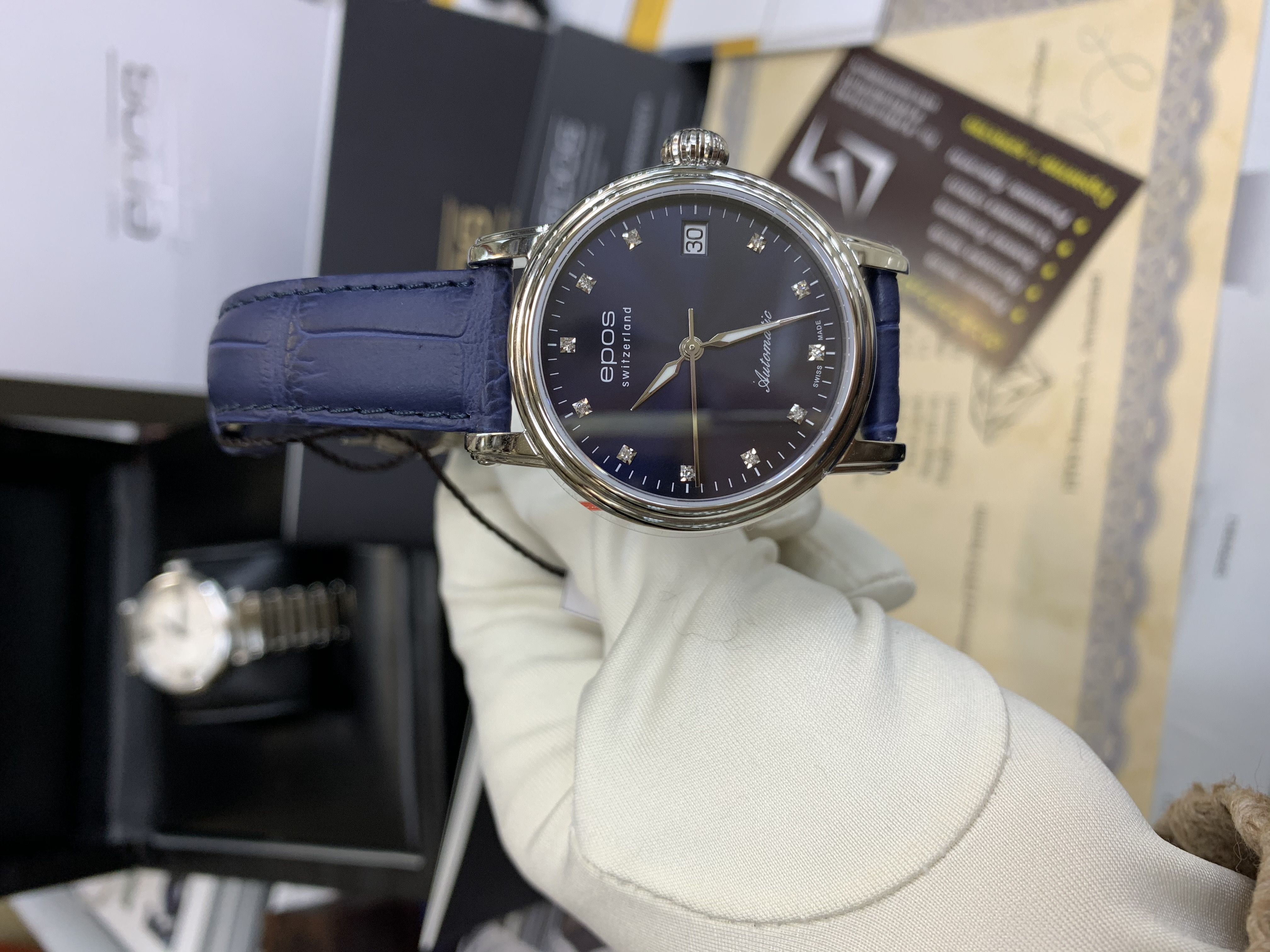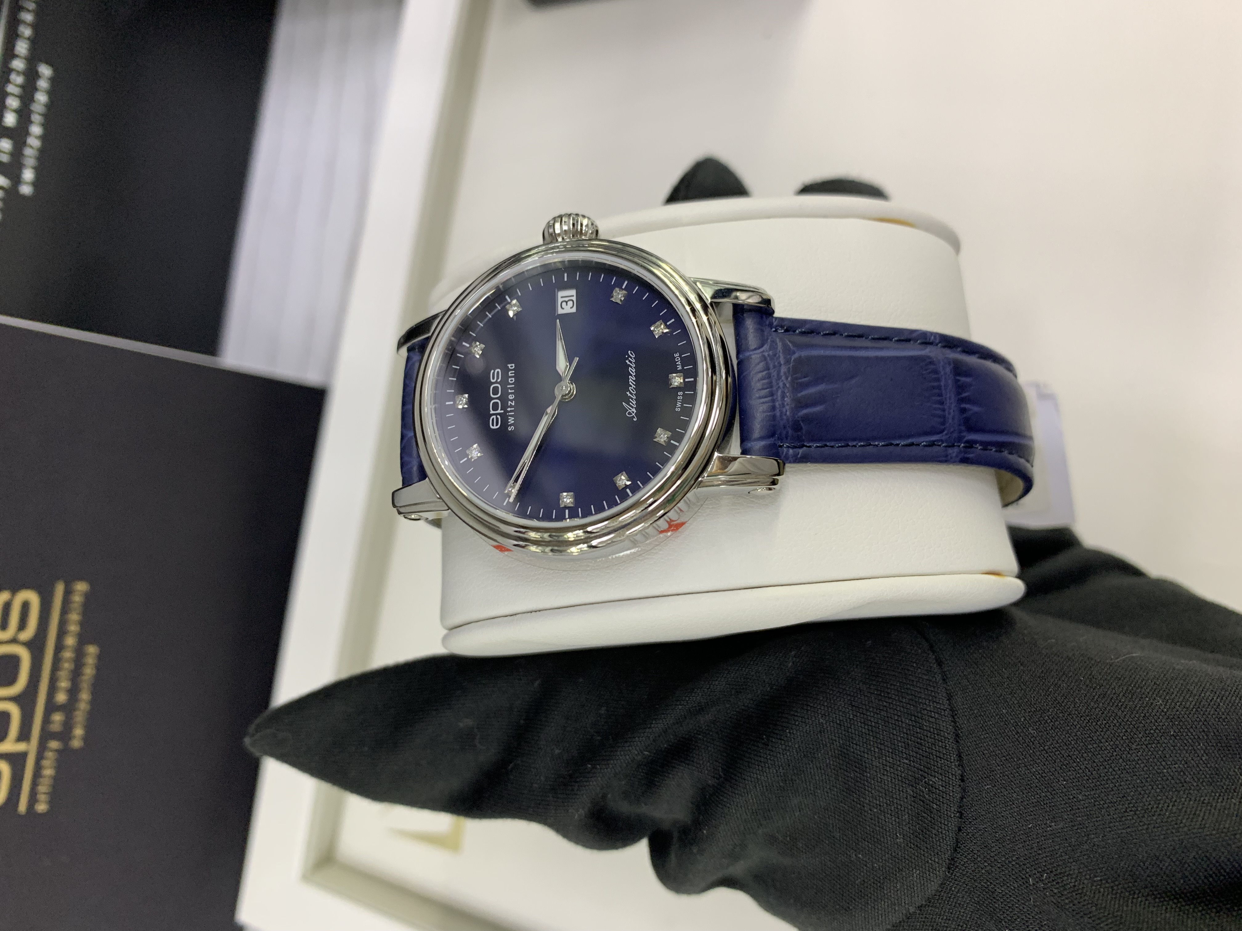Швейцарские механические женские наручные часы с ручным и автоподзаводом Epos 4390.152.20.86.16 на кожаном ремне из натуральной кожи теленка. Корпус часов из нержавеющей стали. Циферблат круглой формы. Сапфировое стекло по прочности, уступающее только алмазу. Водозащита часов 50 метров. Окно даты. Диаметр корпуса: 34 мм. Толщина корпуса: 8 мм. Калибр механизма: ETA 2892. Размер браслета: 16-14 мм. Вставка (количество): 11 Бриллиантов. Кр.17 -0,051 ct -2/3. Вставка (производитель): EPOS Uhren AG, Solothurnstrasse 44, / CH-2543 Lengnau, Switzerland.
