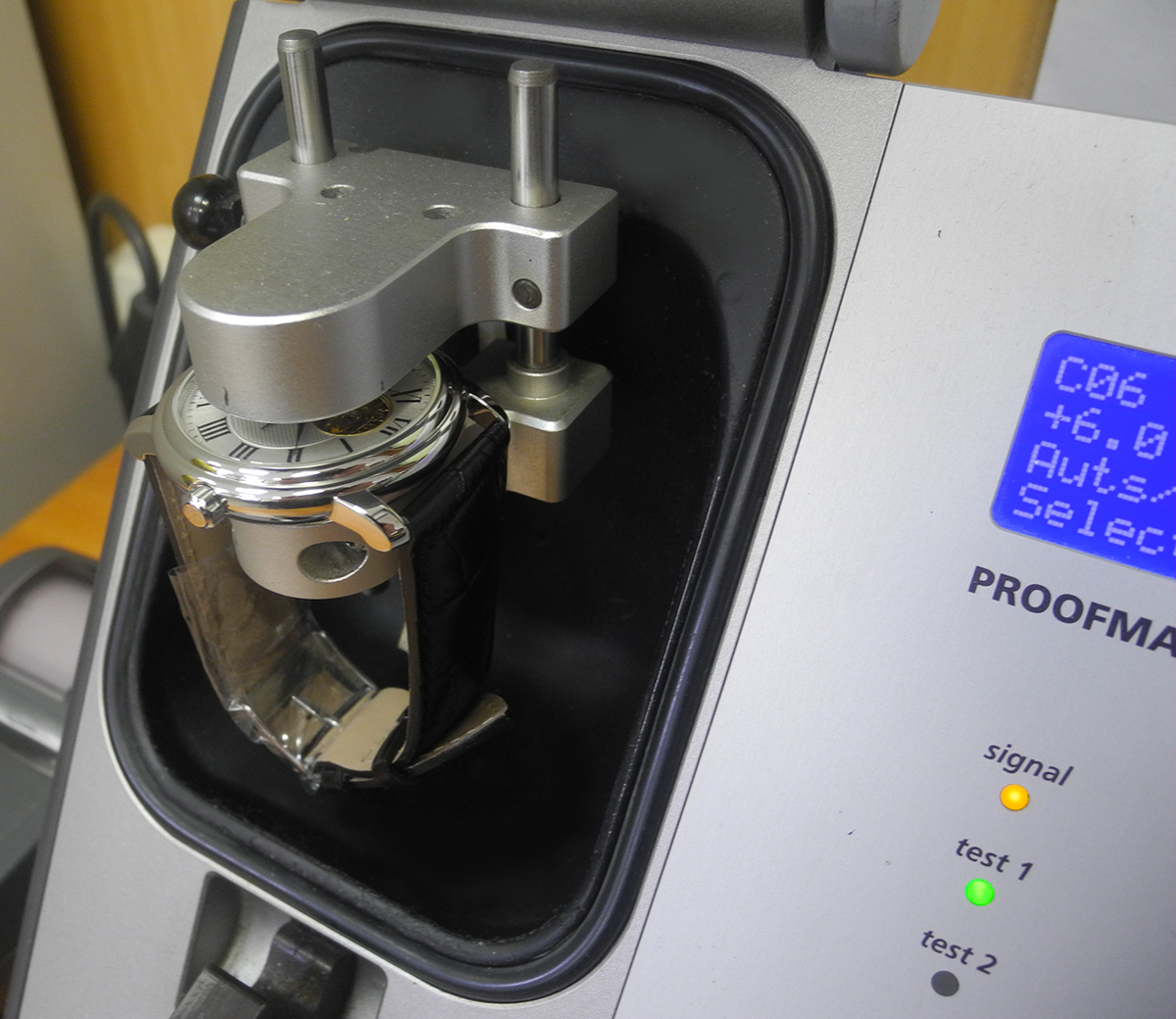 Часы помещаются в воздух над водой и затем подвергаются давлению. Я использую 3 бара на большинстве часов или 5-7 бар для часов, которые будут использоваться для дайвинга. Подождите 15 минут. Если часы протекают, то воздух попадет в часы.