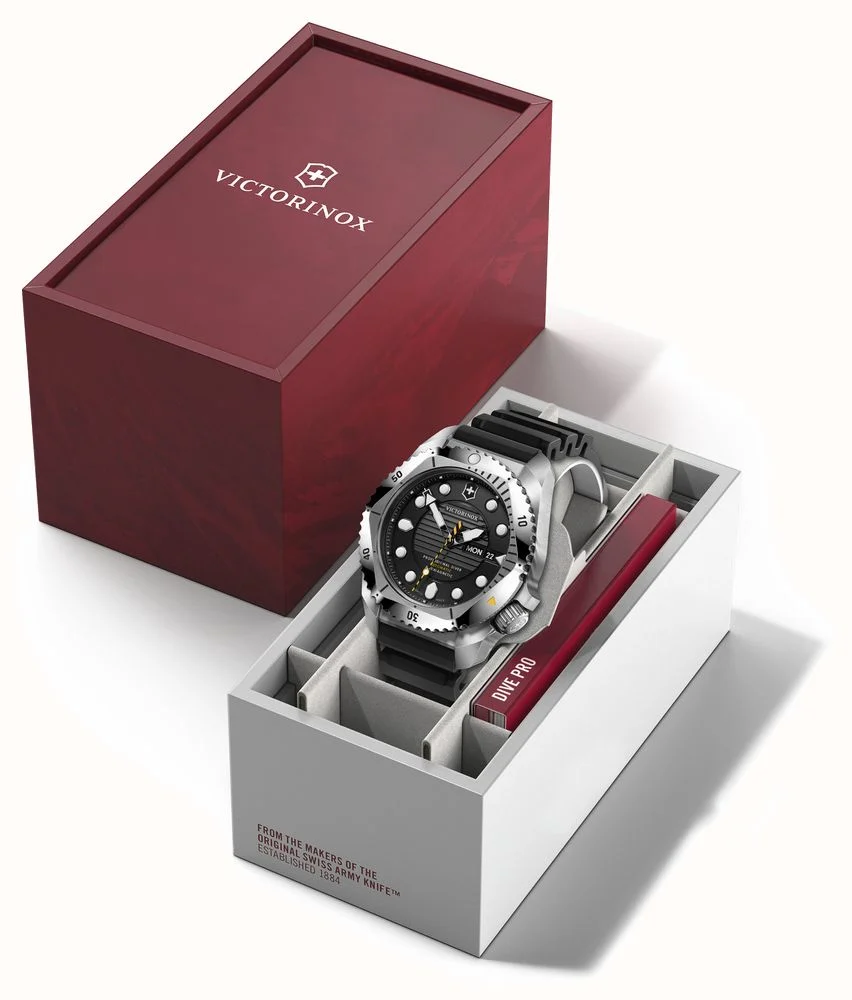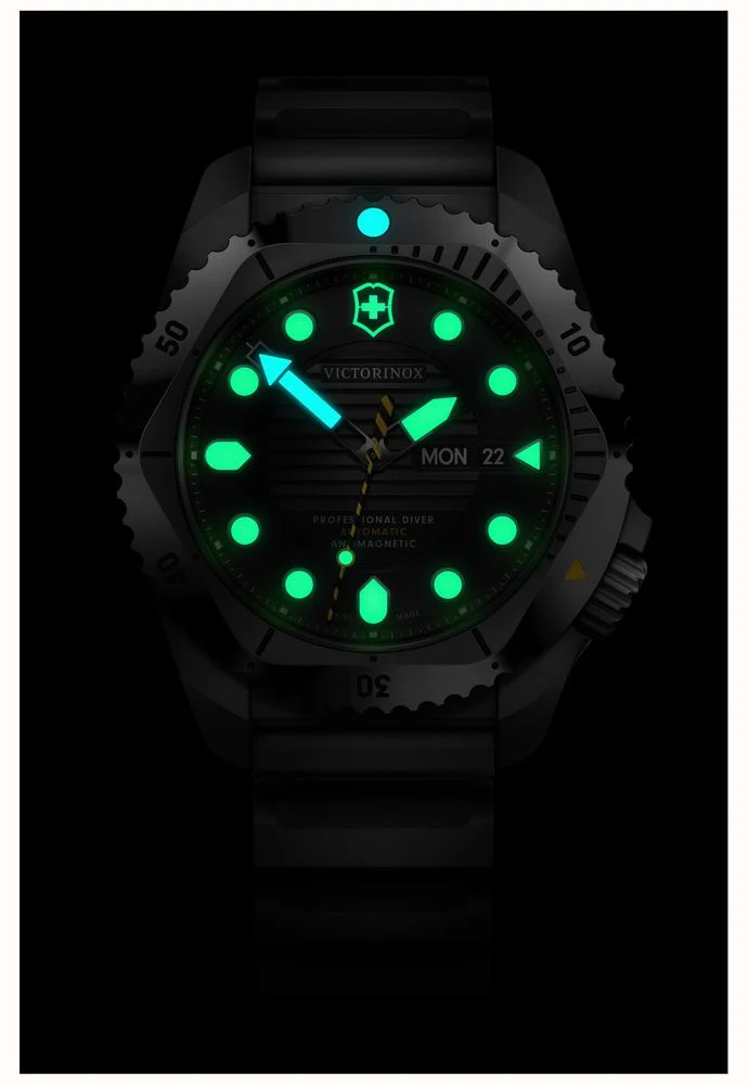 Мужские швейцарские наручные часы Victorinox Swiss Army 241994, швейцарский механический механизм, индикация даты. Циферблат черного цвета. Стальной корпус, диаметр 43 мм, вращающийся безель с покрытием из сапфирового стекла, устойчивым к воздействию UV-лучей, накладные цифры, накладные индексы, люминесцентное покрытие на стрелках, сапфировое стекло с тройным антибликовым покрытием, водоустойчивость 300 м.