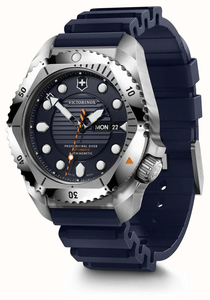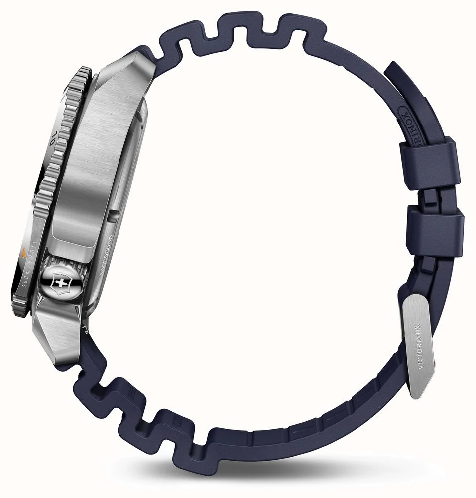 Мужские швейцарские наручные часы Victorinox Swiss Army 241995, швейцарский механический механизм, индикация даты. Циферблат синего цвета. Стальной корпус, диаметр 43 мм, вращающийся безель с покрытием из сапфирового стекла, устойчивым к воздействию UV-лучей, накладные цифры, накладные индексы, люминесцентное покрытие на стрелках, сапфировое стекло с тройным антибликовым покрытием, водоустойчивость 300 м.